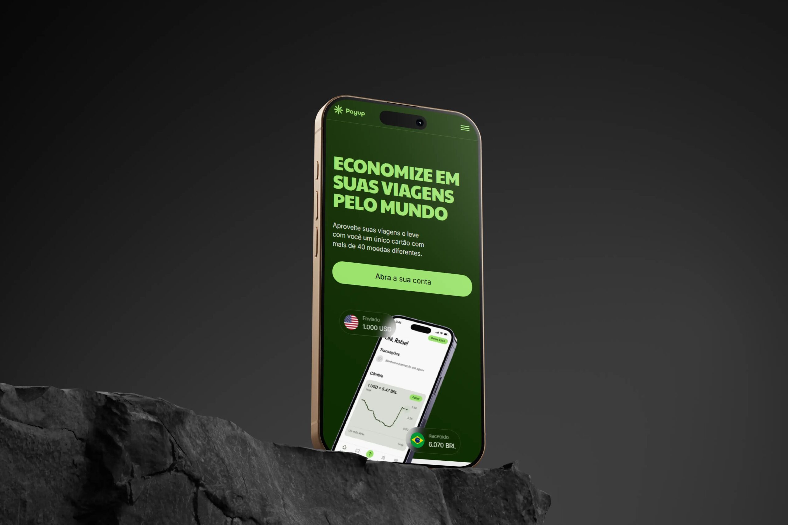Landing page fictícia para a PayUp, plataforma que oferece cartão com mais de 40 moedas diferentes, destacando benefícios e funcionalidades.