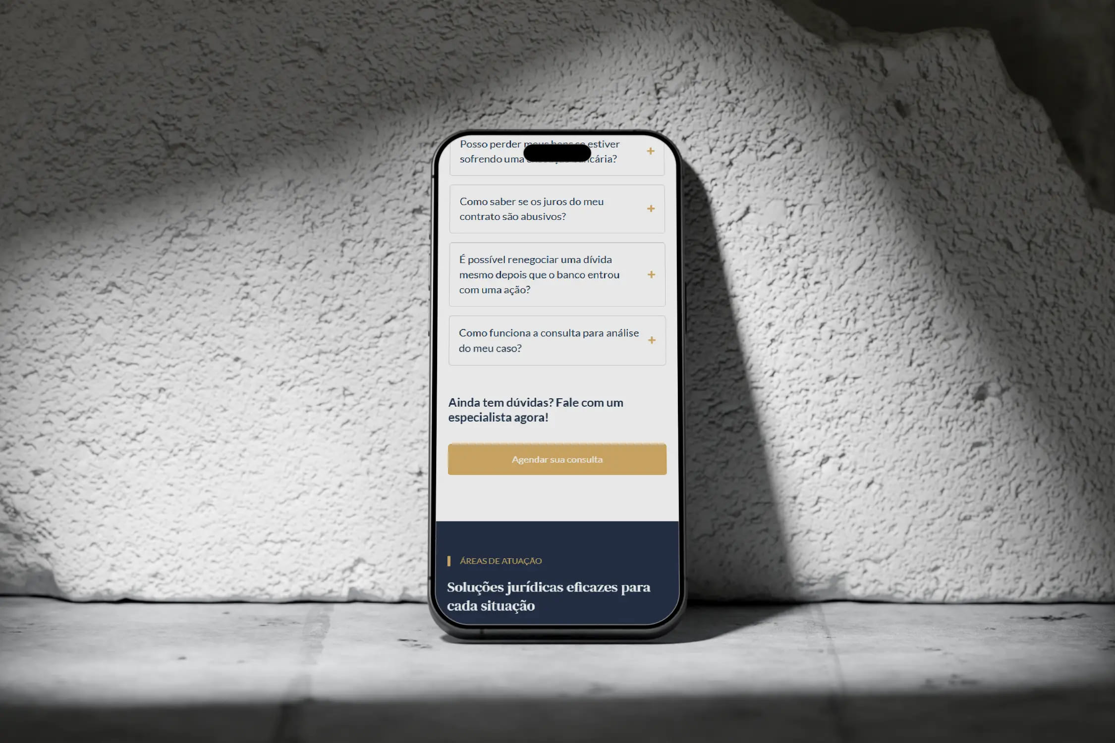 Este projeto foi concebido para um escritório de advocacia especializado em direito patrimonial, com foco na defesa do executado. O objetivo foi criar uma presença digital sólida que transmitisse confiança, seriedade e profissionalismo. O wireframe foi elaborado no Figma, permitindo estruturar cada seção de forma estratégica antes do desenvolvimento.